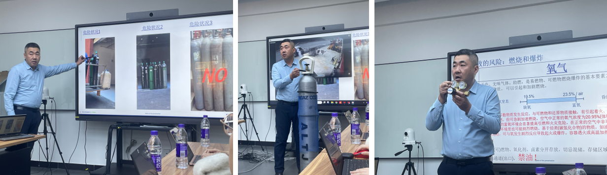 庞天森工程师还结合《气瓶安全技术规程》等国家法规标准,明确了气瓶接收检查、搬运存放、泄漏检测等操作要点。他强调气瓶需按性质分类存放,易燃与助燃气体间距不小于5 米,使用时必须直立固定,现场示范减压表的安装及注意事项,杜瓦桶定期开展桶体(每三年一检)、安全阀(每年一检)、压力表(每6个月一检)等附件检验,严禁使用淘汰瓶帽及不合格设备。培训过程中,参训师生结合实验室日常操作中的实际问题积极提问,庞天森工程师逐一耐心解答,通过互动交流进一步强化了安全认知。